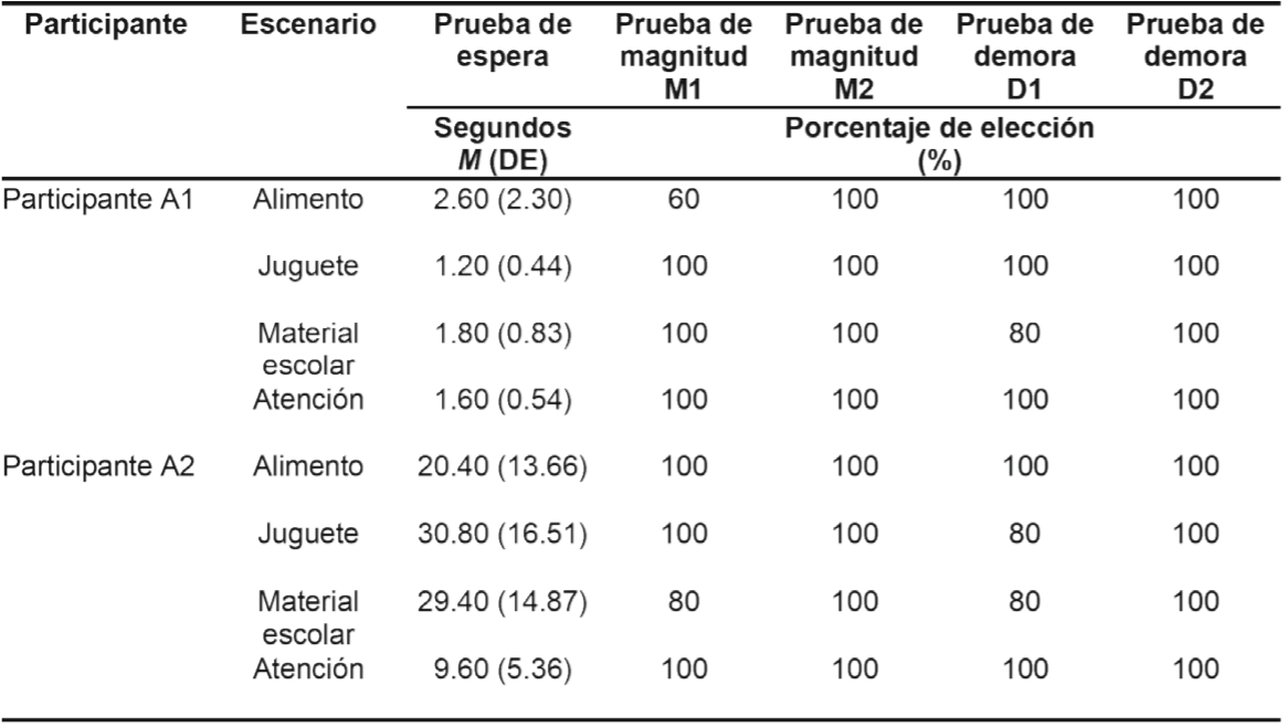 Los resultados de las pruebas pre-experimentales de cada participante se muestran en la Tabla 2. Para el participante A1 se determinó la demora meta de 30 segundos y para el Participante A2 fue de 60 segundos. Ambos participantes mostraron sensibilidad a la magnitud eligiendo los reforzadores de mayor magnitud vs. de menor magnitud en más del 60% de los ensayos en la Prueba de magnitud M1 y M2. Asimismo, mostraron sensibilidad a la demora, eligiendo los reforzadores inmediatos vs. demorados en más del 80% de los ensayos en la Prueba de demora D1 y D2.
