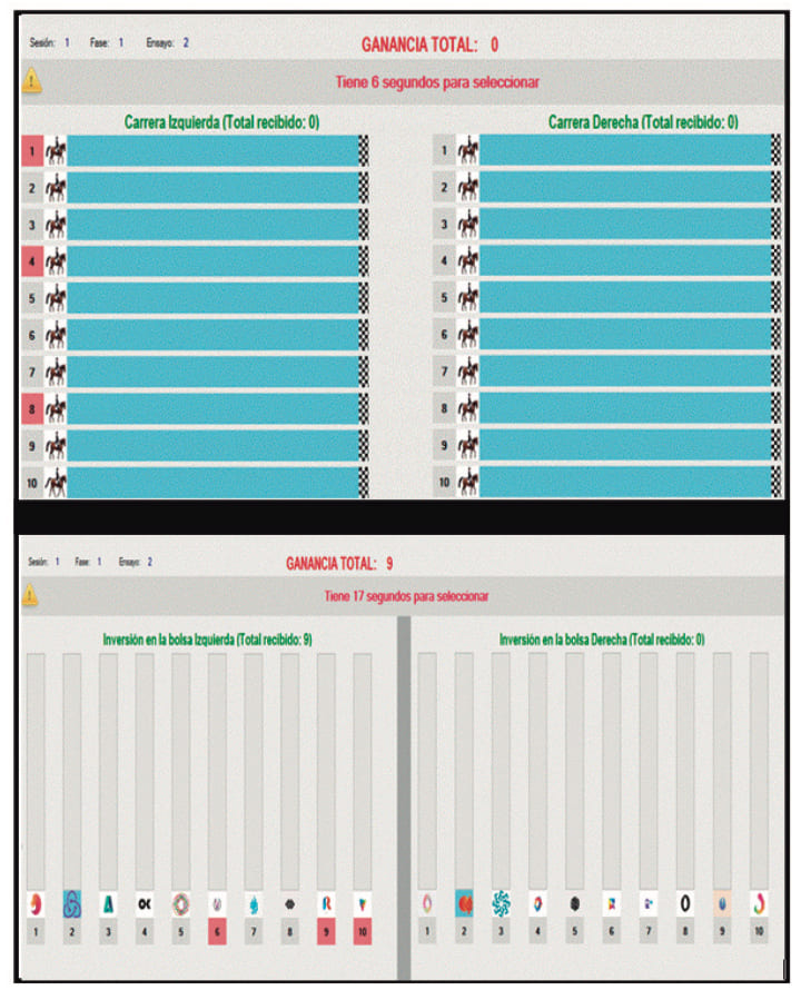 Las tareas experimentales consistieron en dos juegos. Un juego (Etapa 1 y Etapa 2) simuló un hipódromo, en el cual se presentaron de manera simultánea dos carreras de caballos, una al lado izquierdo (Componente C) y otra al lado derecho (Componente R) de la pantalla. Cada carrera tuvo 10 caballos. En esta situación se les pidió a los participantes apostar, para ello debían presionar el botón izquierdo del mouse y elegir una de las dos carreras. El otro juego (Etapa 3) representó dos bolsas de inversiones, con 10 empresas participantes en cada una de ellas, bajo esta tarea se les solicitó a los participantes elegir alguna de las dos bolsas de inversión. En este juego, las respuestas también se realizaron presionando el botón izquierdo del mouse.