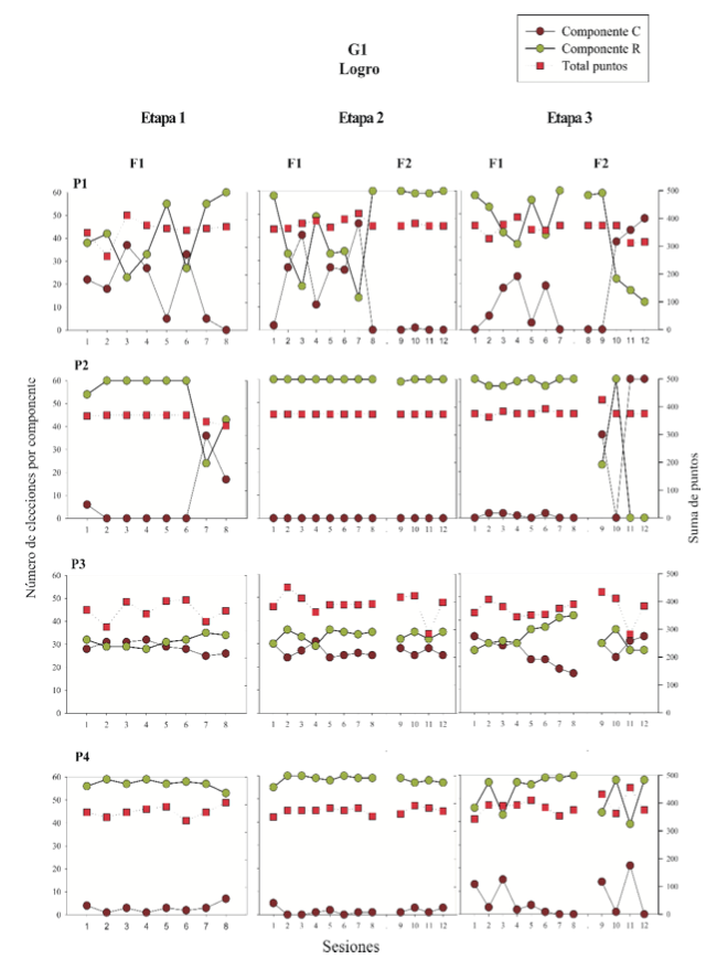En la Fase 1 se identificó que, el modo de elección entre los componentes de respuesta C y R y la suma acumulada fue diferente entre participantes. P1 y P3 mostraron un patrón de respuestas variable en la elección de las alternativas en las Etapas 1 y 2, al contrario, en la Etapa 3 el responder de ambos participantes se inclinó en mayor proporción por el componente R. P2 y P4 mantuvieron la tendencia de elección hacia el componente R en la mayoría de las sesiones de las tres etapas.