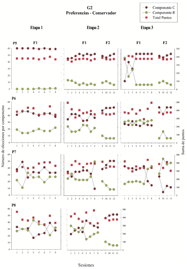 La Figura 3 muestra el número de elección en cada componente de respuesta C y R, así como la suma acumulada de puntos en cada etapa experimental del Grupo 2 – Preferencia – Conservador. De manera semejante que en el Grupo 1, se evidenciaron diferencias individuales en todos los participantes en las tres etapas del experimento en contingencias abiertas. En la Fase 1 (Etapa 1 y 2), P5 y P6 apostaron en mayor proporción en el componente C, esta tendencia de respuestas cambió en la Etapa 3, pues los participantes alternaron sus elecciones entre los componentes C y R. En contraste, P7 y P8 tendieron a alternar sistemáticamente en ambos componentes de respuesta.