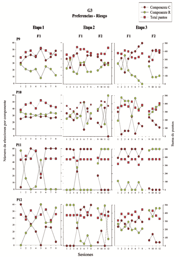 La Figura 4 muestra el número de elección en cada componente de respuesta C y R, así como la suma acumulada de puntos en cada etapa experimental del Grupo 3 – Preferencia – Riesgo. Se observa que las ejecuciones en la Fase 1 de cada etapa fueron disímiles entre los participantes: P9 y P11 evidenciaron patrones de respuestas variables, aunque, tendieron a apostar en mayor proporción en el componente C. Contrario a P10, quien alternó en ambos componentes de respuesta, mostrando mayor preferencia por el componente R. P12 mostró un patrón variable, inclinándose en la Etapa 1 por el componente C y en las demás etapas eligiendo proporcionalmente los dos componentes.
