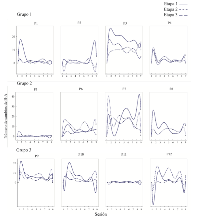 Por último, en el Grupo 3, P9, P11 y P12 fueron consistentes en las tres etapas, exponiendo diferentes curvas entre ellos. P10 fue consistente en la mayoría de las sesiones de las tres etapas, excepto en la Etapa 1 donde al final de la sesión mostró una curva decreciente.