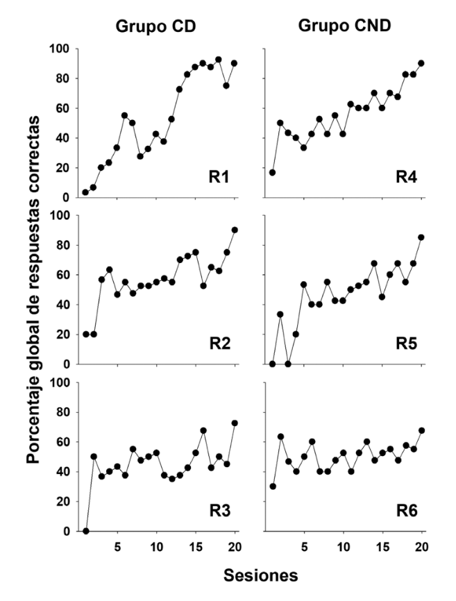 La Figura 1 muestra el porcentaje global de respuestas correctas a lo largo del experimento para cada rata. En la figura se observa que el porcentaje global de respuestas correctas incrementó desde niveles cercanos o iguales a cero hasta valores cercanos o iguales a 90% para las ratas R1 y R2 del Grupo CD y las ratas R4 y R5 del Grupo CND. Para la rata R3 del Grupo CD y la rata R6 del Grupo CND, la ejecución alcanzó valores de 72% y 67% de respuestas correctas, respectivamente.