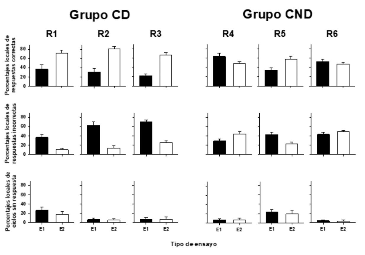 En lo que a los porcentajes de respuestas correctas se refiere, en los paneles superiores de la Figura 2 se observa un menor porcentaje de respuestas correctas en los ciclos en los que se agregó E1 que en los ciclos en los que se agregó E2 para las ratas del Grupo CD. Específicamente, para las ratas R1, R2 y R3 se observaron, en promedio, porcentajes locales de respuestas correctas de 36% y 71%, 30% y 91% y de 22% y 67% en los ciclos en los que se agregaron E1 y E2, respectivamente. Para las ratas del Grupo CND, el promedio de los porcentajes locales de respuestas correctas en los ciclos en los que se agregaron E1 y E2 fue, respectivamente, de 63% y 48% para R4, de 34% y 57% para R5 y de 52% y 47% para R6.
