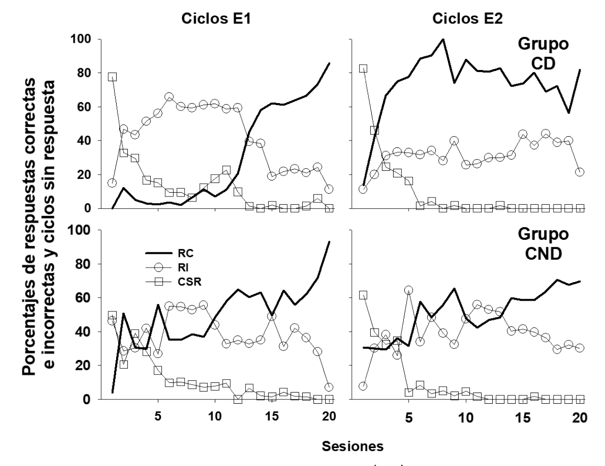 La Figura 3 muestra el promedio grupal de los porcentajes de respuestas correctas (RC), respuestas incorrectas (RI) y ciclos sin respuesta (CSR) en los ciclos en los que se agregó E1 (izquierda) y los ciclos en los que se agregó E2 (derecha) a lo largo del experimento. En la primera mitad del experimento, en la figura se observa que para el Grupo CD los porcentajes de respuestas incorrectas y respuestas correctas en los ciclos en los que se agregó E1 y E2, respectivamente, alcanzaron valores similarmente altos y prácticamente el mismo patrón a lo largo de las sesiones. Adicionalmente, se observa que en los ciclos en los que se agregó E1 el porcentaje de respuestas correctas fue cercano a cero e incrementó progresivamente hasta niveles cercanos al 80% en la segunda mitad del experimento. En ésta, se observa que los porcentajes de respuestas incorrectas disminuyeron progresivamente en los ciclos en los que se agregó E1, mientras que en los ciclos en los que se agregó E2 los porcentajes de respuestas incorrectas incrementaron ligeramente. En general, excepto por algunas sesiones intermedias en los ciclos en los que se agregó E1, en la figura se observa que para el Grupo CD los porcentajes de ciclos sin respuesta siguieron una tendencia decreciente y se mantuvieron cercanos a cero a lo largo del experimento, independientemente del estímulo agregado al subciclo t..