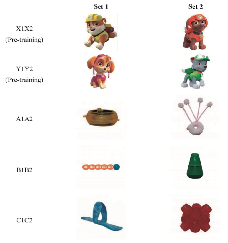A total of 10 visual stimuli were used in the simple discrimination trials. Four figures were used for pre-training (figures from a cartoon, used in the initial trials to familiarize the participant with the task and the differential consequences of their choices) and six for the procedure itself (undefined colored forms, i.e., unrelated to any specific name assigned by the verbal community), divided into two sets (1 and 2) of three stimuli. The six undefined stimuli were taken from an open bank of figures, available online (Horst & Hout, 2016). Figure 1 present the stimuli used in the procedure.