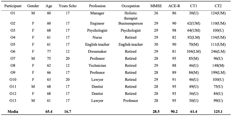 Table 1 presents the general characteristics of the OG participants and their performance in the standardized measures. Eight participants were retired at the time of the study; the rest continued to work regularly. All the participants scored between 28 and 30 in the MMSE (except O1, with a score of 26), therefore, above the cutoff point for cognitive impairment recommended for the test. In the ACE-R, the participants obtained total scores between 81 and 98 points, also above the cutoff point of the instrument for cognitive impairment. In the Color Trail Test, all participants presented an average or above performance: in Form 1, the mean execution time was 61.3s (SD=24.4) and in Form 2, 125.1s (SD=48.4).