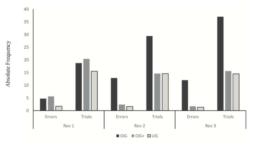 Note. Mean frequency of errors and mean frequency of trials performed in each of the reversals (Rev), for the older adults group that did not achieve the criteria in any of the reversals (OG-), for the older adults that achieved the criterion in all reversals (OG+) and for the college students group (UG).