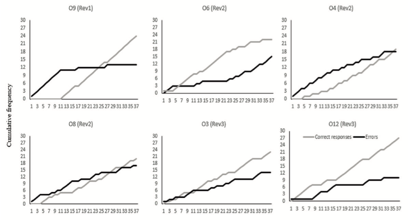 It is possible to see that none of the participants maintained a stable pattern of correct responses throughout the block, even when the correct response curve was clearly upward. Participant O9, for example, who did not achieve criterion in the first reversal, presented a sequence of incorrect responses at the beginning of the block. Then, the participant presented successive sequences of correct responses, interspersed with occasional incorrect responses, which did not allow the criterion of 12 successive correct responses to be achieved.