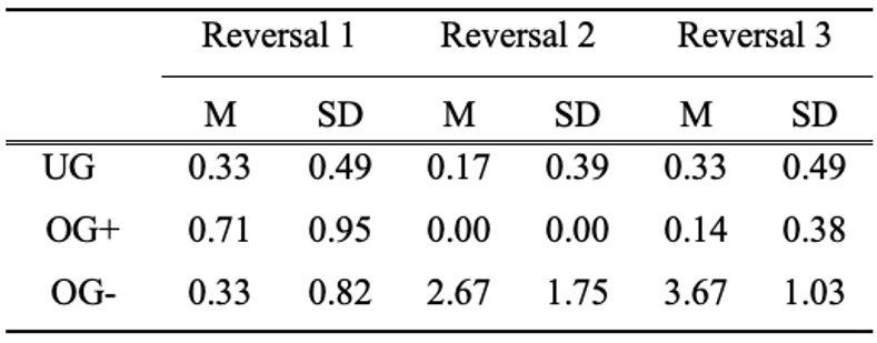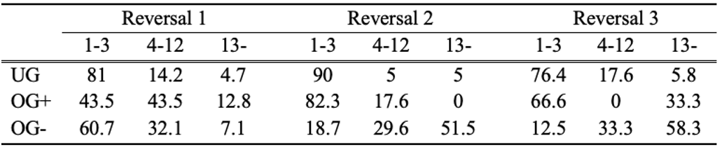 Table 2 presents the distribution of errors (in percentage) in each reversal for the UG, OG+, OG- participants. Table 2 shows that, for the UG, the highest percentage of errors was always concentrated in the first three trials of each reversal. Some sparse errors occurred throughout the block, however, these errors were concentrated until the 12th trial. For the OG+, it was observed that, in the first reversal, the majority of the errors were concentrated until the 12th trial, with an equal distribution in the initial portion (until the 3rd trial) and middle of the block (until the 12th trial). In the subsequent reversals, the errors tended to be concentrated in the first three trials, indicating learning of the task. In the OG-, however, it was observed that the highest percentage of errors was gradually concentrated in the final part of the block (after the 13th trial) throughout the reversals, indicating the deterioration of the participants’ performance: while in the first reversal the highest percentage of errors was concentrated until the 3rd trial (60%), in the third reversal the highest percentage of errors (58%) occurred after the 13th trial.