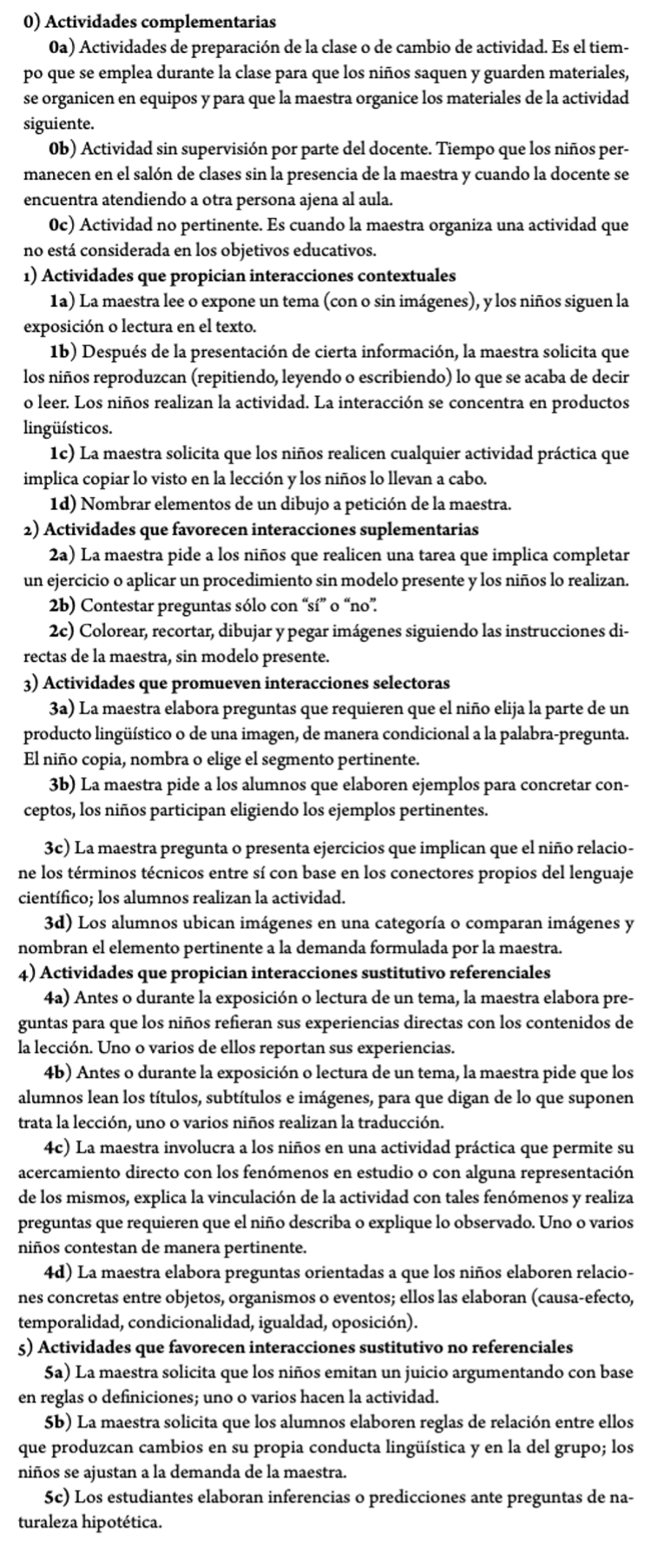 Confiabilidad. Dos codificadores de manera independiente identificaron cada segmento de interacción y su categoría, así como la duración, considerando todos los elementos presentes en la clase (lo que promovía la maestra, lo que hacían los niños, los materiales utilizados como libro, cuaderno, pizarrón, hojas impresas). Posteriormente, se tomó la confiabilidad entre los codificadores y los casos en los cuales había desacuerdo con respecto a la ubicación de un episodio en una categoría o su tiempo de duración, se revisaba nuevamente el episodio y se llegaba a un acuerdo. Finalmente, todas las variables del estudio se analizaron con el programa estadístico SPSS.