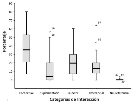 El diagrama de caja divide los puntajes obtenidos en cuartiles, el primer cuartil está representado por el bigote inferior, el segundo y el tercer cuartil se encuentran en la caja y el cuarto cuartil se representa por el bigote superior. Este tipo de gráficas muestra tanto la dispersión de los datos como la puntuación mínima y máxima, así como los valores atípicos que se encuentran arriba o abajo de los bigotes. Como se puede observar en esta figura, el mayor porcentaje del tiempo de la clase se dedicó a promover interacciones contextuales, seguidas por las selectoras, referenciales, suplementarias y no referenciales.