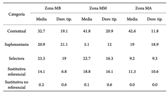 En la Tabla 1 se presentan por zona, las medias y desviaciones típicas del porcentaje del tiempo dedicado a propiciar cada uno de los niveles de interacción de los alumnos con los objetos educativos. Es posible apreciar algunas diferencias importantes entre las medias de la zona MM con respecto a las zonas MB y MA en la promoción de interacciones suplementarias, ya que el porcentaje medio de tiempo dedicado a promover este nivel fue mayor en éstas últimas. De la misma manera, se aprecia también una diferencia importante entre la zona MA con respecto a las zonas MB y MM en la instigación de interacciones selectoras, siendo mayor el porcentaje medio de tiempo dedicado al nivel selector en las dos últimas.