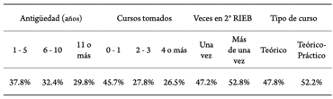 En términos generales se observa que los docentes se distribuyen de manera similar en los tres rangos de antigüedad (37.8%, 32.4% y 29.8%) y que cerca de la mitad de ellos imparte por primera vez el segundo grado de primaria dentro del Plan de Estudios 2011 (47.2%). En el número de cursos que los profesores han recibido, se reporta que el 45.7% se encuentra en el rango de cero a un curso; el 27.8% ha recibido entre dos y tres y el 26.5% de cuatro a más cursos. También se reporta que el 47.8% de estos cursos fueron de tipo teórico, en su mayoría evaluados por medio de la asistencia, entrega de trabajos de tipo ensayo y exposiciones; mientras que el 52.2% reporta que los cursos fueron teórico-prácticos, consistentes en juego de roles, entrega de evidencias de las actividades realizadas y elaboración de rúbricas.