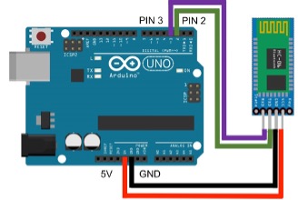 Arduino® Uno board and HC-06 Breakout Bluetooth Module. The connections shown are necessary to change the default name and password. The Pin VCC in module is connected to Arduino® Pin labeled 5V, Pin GND is connected to GND Pin in the Arduino. Pins RXD and TXD in the module are connected to Arduino ® Pins 3 and 2, respectively.