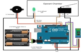 A microswitch with a metal lever was used to record responses. With this arrangement, output and input pins in the Arduino Uno® board were connected directly to the operant-conditioning chamber as shown in Figure 3. A solderless breadboard was used to facilitate connections and to avoid soldering the devices.