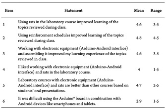 The Arduino® - Android® interface was tested in a laboratory course on the experimental analysis of behavior for 12 undergraduate students halfway through their Bachelor degree at the National Autonomous University of Mexico. Android devices used included smartphones and tablets. The 16-week course consisted of 3 hours per week of lectures accompanied by readings of a textbook: Behavior Analysis and Learning (Pierce & Cheney, 2004), and a 2-hour-per-week laboratory in which the interface was used. The interface was used for shaping lever pressing, and for generating fixed-ratio, fixed-interval, variable-ratio, and variable-interval schedules of reinforcement. To assess perceived value, effectiveness, and ease of use, a 6-item questionnaire prepared by the authors was used. The students rated each item using a Likert scale ranging from 1 (strongly disagree) to 5 (strongly agree). The questionnaire was sent to the students and returned by email. Ten students returned the questionnaires. Table 4 shows an English translation of the items, and the mean and range of responses for each item. Items 1 and 2 evaluated perceived importance of laboratory courses involving rats and reinforcement schedules. In response to these items, all students reacted positively to the laboratory course. In response to Item 3, students reported that the use of electronic equipment was important for improving learning during the classes (. = 4.6, range, 3-5). In response to Item 4, 80% of the students reported that working with electronic equipment was a positive experience (. = 4, range, 1-5). Nine students reported that working with electronic equipment and rats was better than other techniques, for example students’ oral presentations, commonly used in similar courses (. = 4.7, range, 2-5). Fifty percent of the students reported that they found difficult working with the interface. One explanation for such results is that some of the devices used by students had limited hardware and software specifications that produced a nonoptimal experience with the app. These issues, however, were helpful to determine the current minimum requirements of the interface.