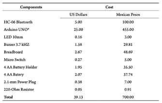The Arduino® Uno board is connected to 4 AA batteries using a 2.1 mm center-positive connector (see the arrangement in Figure 3) to function independently of a computer. The Bluetooth Module can be detected using Bluetooth settings in Android® devices. After the device is detected it should be paired with the Android® device using PIN code 1234 (or any custom code assigned previously). The price of the breadboard, LED, buzzer, battery holder, and lever used in our tests was approximately 40 US dollars (700 Mexican pesos). A detailed list of the components appears in Table 1. All these resources can be reused multiple times in different courses.