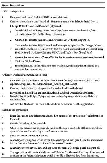 Download the file Arduino_Android_Mobile.ino (http://analisisdelaconducta.net/wp-content/uploads/2018/01/Arduino_Android_Mobile.zip) from the authors’ website. Open the file within the Arduino® IDE, and upload it to the Arduino UNO® board. Connect the HC-06 Module as shown in Figure 3.