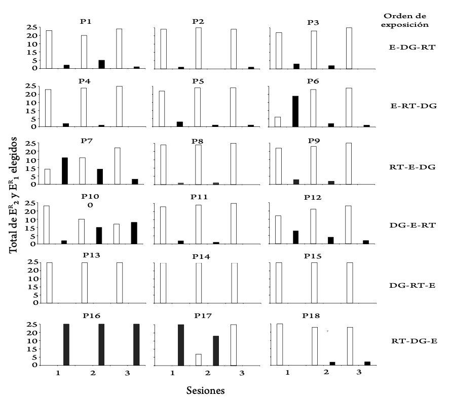 En la Figura 2 se muestra el número de E.2 (barras vacías) y E.1 (barras llenas) elegidos en cada sesión por cada participante en el procedimiento de elección. En cada fila se muestran los datos de las participantes conforme al orden al que fueron expuestas a cada procedimiento.