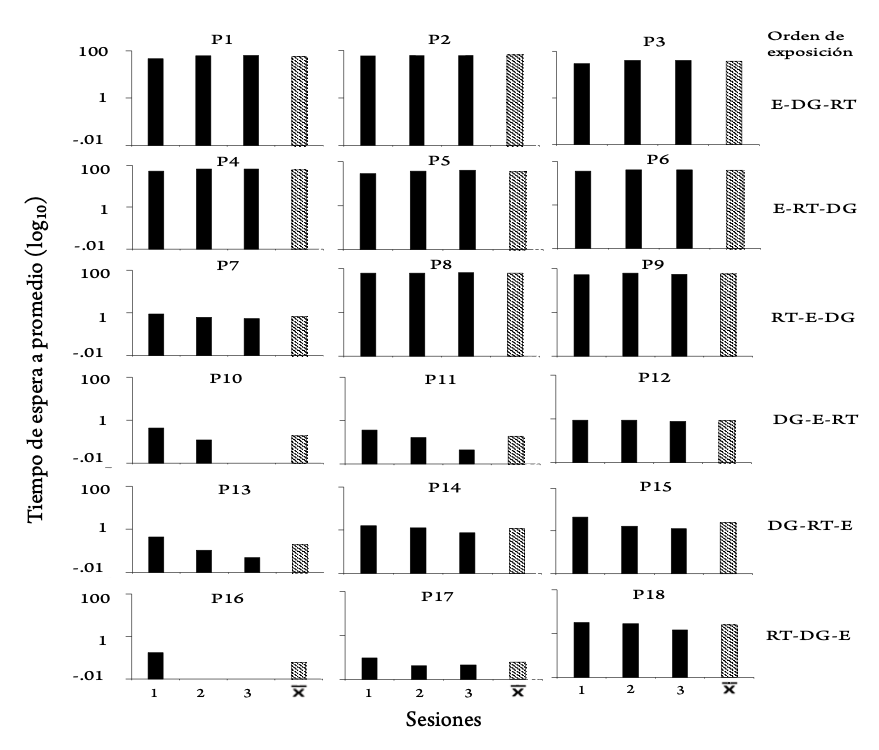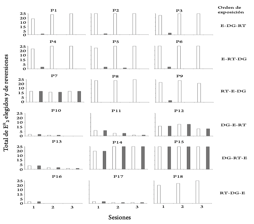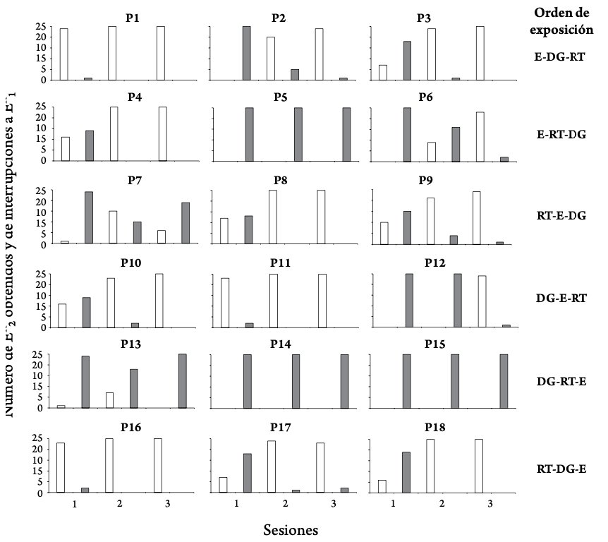 El número de E.2 obtenidos varió entre participantes, dependiendo de la secuencia de exposición a los tres procedimientos; se observó un posible efecto de orden de presentación entre el procedimiento de elección (E, barras obscuras) y el de demora de la gratificación (DG barras vacías), ocho de las nueve participantes que fueron expuestas al procedimiento de elección antes que al de demora de la gratificación obtuvieron globalmente los 25 E.2 programados por sesión, en ambos procedimientos (ej. P1, P2, P3, P4, P5, P6, P8 y P9). Por el contrario, de manera general ocho de las nueve participantes expuestas al procedimiento de DG antes del de elección no obtuvieron los E.2 programados por sesión durante el procedimiento de demora de la gratificación (ej. P10, P11, P12, P13, P14, P15, P16 y P17).