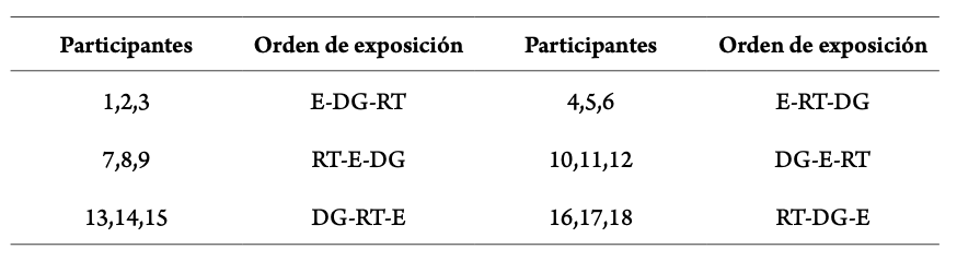 Conforme a un diseño entre-grupos, se expuso a tres participantes a una de seis combinaciones diferentes del orden en el que se presentaron los tres procedimientos de autocontrol durante el estudio, como se muestra en la Tabla 1.