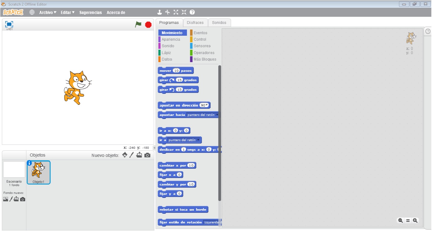 La Figura 1 muestra una captura de pantalla de la interfaz de programación de Scratch, tal como aparece por default al inicializar la versión offline Scratch 2.0. El menú principal cuenta con los botones que permiten ir al sitio web, cambiar el idioma del programa, el menú de Archivo, de Edición, sugerencias de tutoriales o guías para crear nuevos proyectos y la opción para conocer más acerca de Scratch. También incluye botones de acciones específicas para el uso de bloques de programación: duplicar, cortar, cambiar de tamaño, así como para acceder a la ayuda de bloques.
