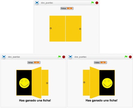 Se diseñó una tarea semejante a la versión original de Daugherty y Quay (1991), con la diferencia de que se presentaron dos puertas (en lugar de una) en cada ensayo. El motivo de la modificación del procedimiento original obedece a propósitos relacionados con otras investigaciones en curso, en las que resulta relevante esta manipulación pero se requería probar en primer lugar la utilidad de Scratch para programar la tarea. En la Figura 2 se muestran capturas de pantalla que ilustran lo que aparecía en el monitor ante los participantes. En el panel superior se muestra la imagen que aparecía al inicio de cada ensayo, i.e., “dos puertas cerradas”. Si los participantes elegían jugar, debían presionar la flecha izquierda del teclado para “abrir” la puerta izquierda (panel inferior izquierdo), o bien, presionar la flecha derecha para abrir la otra puerta (panel inferior derecho). Si los participantes elegían abandonar el juego, debían presionar la tecla Escape para salir de la tarea experimental. Para distinguir en el escenario cuando el participante “ganaba” o “perdía”, al abrirse las puertas se presentaba durante 500 ms una imagen que simulaba una “cara sonriente” o una “cara triste”, acompañadas de la leyenda “Has ganado una ficha!” O “Has perdido una ficha!”, respectivamente. En cuanto finalizaba la presentación de la cara y leyenda correspondiente, se volvía a presentar inmediatamente la imagen de las dos puertas cerradas.
