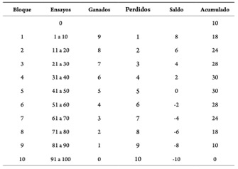 En la Tabla 2 se muestran el número de fichas que los participantes podían ganar o perder en cada bloque de ensayos, así como el saldo a favor (o en contra) y el número acumulado de fichas al finalizar cada bloque. La probabilidad de ganar (o perder) estuvo determinada por la proporción de ensayos exitosos programados en cada bloque y fue independiente de la puerta que el participante elegía abrir (i.e., el resultado en cada puerta era el mismo en cada ensayo).