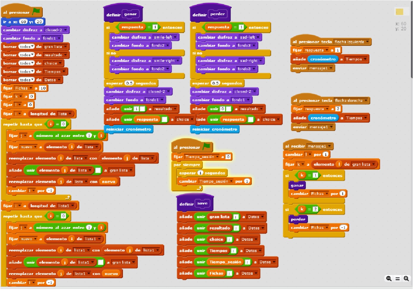 En la Figura 3 se muestra una captura de pantalla del área de escritura, en la que aparecen siete conjuntos de bloques completos y la parte de un bloque considerablemente más largo que los demás, pero cuya función se describe a continuación. El conjunto de bloques más largo se iniciaba al presionar la bandera verde visible en el escenario del programa, coloca al objeto en una posición específica dentro del plano y establece al fondo completamente blanco y a las puertas cerradas como el inicio de la tarea. Limpia los valores de las variables y listas involucradas en la tarea, estableciendo como valor inicial del número de fichas igual a 10. Posteriormente, se activaba un algoritmo repetitivo para leer una serie de 10 listas de valores previamente importadas de una serie de archivos de texto, las cuales tenían una longitud de 10 elementos configurados de tal manera que la primera lista contenía nueve valores “1” y un valor “2”, la segunda lista contenía ocho valores “1” y dos valores “2”, y así sucesivamente hasta el caso de la décima lista que contenía 10 valores “2”. El algoritmo repetitivo hace una extracción aleatoria de los elementos de cada lista cada vez que se inicia el programa, de tal manera para cada participante se puede generar aleatoriamente una “gran lista” de 100 elementos que permite una configuración de éxitos y fracasos como la descrita en el procedimiento.