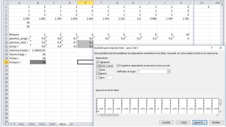 En la Figura 4 se muestra la captura de pantalla de un ejemplo de cómo aparecen los datos al ser importados a una hoja de cálculo de Excel (filas 1 a 6, de la columna A a la columna CV) desde el archivo creado a partir del bloque Guardar (diseñado por los autores). En la misma imagen se muestra en la esquina inferior derecha las casillas que hay que activar al momento de abrir el archivo de texto desde la aplicación Excel (separación por espacios y por punto y coma) para que al momento de abrir el archivo de texto, muestre cada valor en una celda diferente (y no a todos los valores en una sola celda).