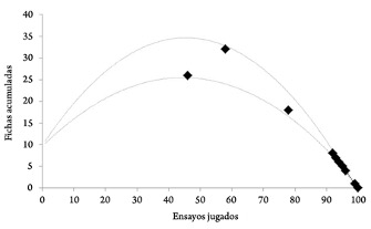 Si bien se contó con la posibilidad de registro de diferentes datos, por motivos de espacio y de énfasis en la prueba del funcionamiento de algoritmo programado, se muestra en la Figura 5 únicamente el número de fichas acumuladas en función de los ensayos jugados para cada participante. Así mismo, se proyectan en el plano dos líneas punteadas que describen el mínimo y máximo número esperado de fichas acumuladas en cada uno de los 100 ensayos, de acuerdo con la probabilidad decreciente de ganar a lo largo de la tarea. Se encontró que dos de las participantes abandonaron el juego en el ensayo 45 y en el 60, lo cual corresponde con el momento óptimo para hacerlo en el sentido de que es justo cuando se ha acumulado el mayor número de fichas antes de comenzar a perderlas con una probabilidad cada vez mayor. El resto de participantes eligieron seguir apostando hasta llegar al Bloque 10, en el que finalizaron con menos de las 10 fichas que se les habían otorgado al inicio de la tarea, una de ellas incluso jugó hasta perder todas las fichas.
