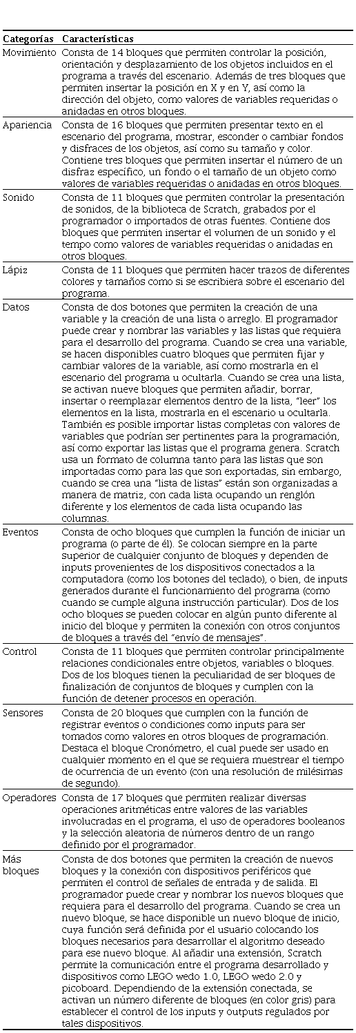 La sección de la plataforma de Scratch más relevante para el desarrollo de programas es la paleta de bloques, junto con el área de escritura. El programa incluye 10 categorías de bloques de construcción con diferentes funciones e identificados con diferentes colores: Movimiento (azul), Apariencia (violeta), Sonido (rosa), Lápiz (verde oscuro), Datos (naranja), Eventos (café), Control (amarillo), Sensores (azul claro), Operadores (verde claro), Más bloques (púrpura). En la Tabla 1 se describen las funciones básicas de cada categoría de bloques. Los bloques tienen la forma de piezas de rompecabezas y se pueden organizar de manera secuencial en el área de escritura para crear uno a más algoritmos independientes o relacionados, los cuales colectivamente controlan lo que ocurre en el escenario. La programación consiste en seleccionar los bloques que encajan de manera automática creando instrucciones con una sintaxis apropiada. Las áreas de programación están siempre visibles mientras se elabora el programa, aunque se puede ocultar todo cuando el programa está en operación y mostrar únicamente el escenario.