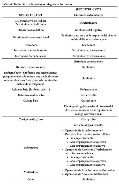 Desde hace más de una década, nuestro equipo de investigación viene desarrollando sistemas de categorías morfológicas y funcionales para identificar los procesos que subyacen la interacción verbal terapéutica (Froxán-Parga & Galván-Domínguez, 2015; Froxán-Parga, Montaño, Calero, García, Garzón, & Ruiz-Sancho, 2008; Ruiz-Sancho, 2011). A lo largo de todos estos años, estos registros de categorías han ido evolucionando hasta convertirse en un sistema totalmente funcional, en el que se incluye, además de las categorías operantes, aquellas verbalizaciones que podrían dar lugar a procesos de condicionamiento clásico. Dicho sistema, al que hemos denominado SISC-INTER-CVT-R, se presenta en la Tabla 1, pudiéndose encontrar su descripción completa en el Apéndice. Dado que el terapeuta tiene un papel directivo en la terapia y que lo que se pretende observar es cómo su conducta verbal influye en la conducta del cliente (Calero Elvira, 2009; Ruiz-Sancho, 2011), los registros definen el comportamiento verbal del terapeuta como función de antecedente, consecuente y/u operaciones disposicionales (que alteran el valor del antecedente y/o consecuente). La conducta verbal del cliente, por otro lado, se registra con el sistema de categorías SISC-CVC (Tabla 1), con función de respuesta (segunda parte de la cadena E-R-E), y es clasificada según su topografía.