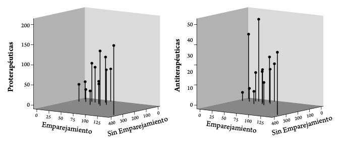 Diagrama de dispersión con los coeficientes no estandarizados para el análisis de regresión lineal múltiple de las verbalizaciones pro y antiterapéuticas de los clientes. Los ejes Y expresan la suma de los registros codificados por cliente en su totalidad de sesiones (verbalizaciones de tipo pro y antiterapéuticas). Los ejes X₁ y X₂, la suma de los registros codificados por terapeutas en todas las sesiones, siendo X₁ las verbalizaciones con emparejamiento pavloviano, y la X₂, las sin emparejamiento pavloviano. Los puntos representan los clientes. La ecuación de regresión sigue Proterapéuticas = 20.5 + 1.2*Emparejamiento -.08*Sin Emparejamiento; R²= .64; Error típico= 28.4 y Antiterapéuticas = 16 + .24*Emparejamiento -.07*Sin Emparejamiento; R²= .14; Error típico= 13.8.