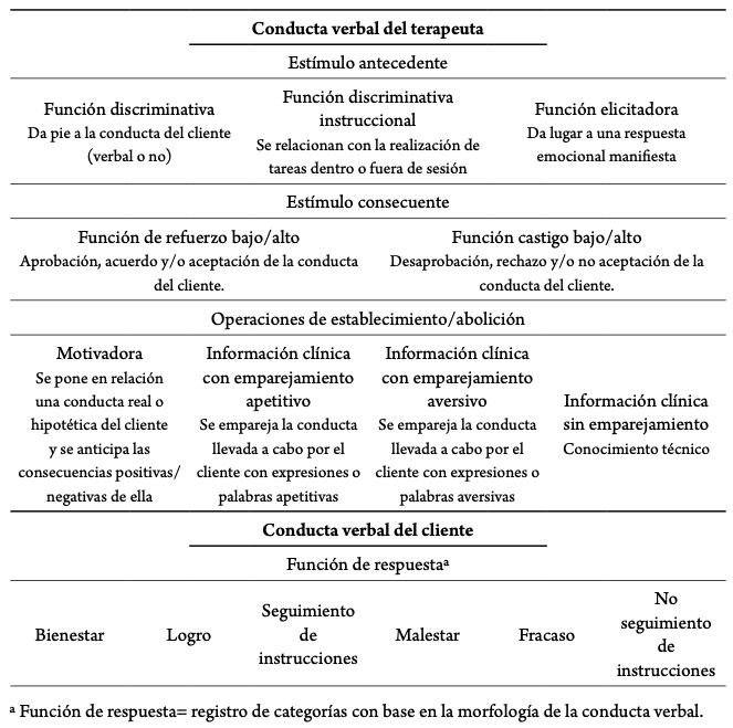 Con base en este planteamiento, y con el afán de desgranar los procesos implicados en la interacción verbal terapéutica, la investigación partió fundamentalmente de un análisis de condicionamiento operante, centrándose en explicar cómo se proporcionan contingencias en sesión con el objetivo de moldear la conducta del cliente (Calero Elvira, 2009; Follete et al.,1996; Froxán-Parga, et al., 2011). Sin embargo, aunque el papel de los modelos operantes sea esencial para el estudio del lenguaje, solo nos muestran cómo la conducta verbal se mantiene, pero no atiende a cómo los procesos simbólicos se desarrollan (Tonneau, 2001).
