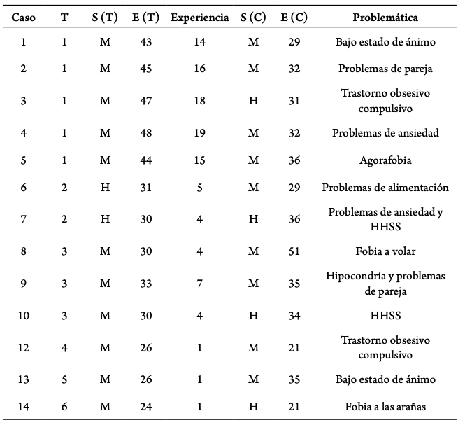 Para llevar a cabo el estudio se analizaron 55 grabaciones de sesiones clínicas individuales correspondientes a un total de 14 clientes adultos tratados por seis terapeutas de orientación conductual con diferentes niveles de experiencia (las características en detalle se encuentran en la Tabla 2). El tiempo total de grabaciones fue de 46 horas y 53 minutos. La muestra fue seleccionada al azar. Todos los casos provienen del Instituto Terapéutico de Madrid (ITEMA), centro clínico privado, y se obtuvo, además del consentimiento informado de las observaciones y análisis de los casos para todos los participantes, la respectiva aprobación por el Comité de Ética de la Universidad Autónoma de Madrid.