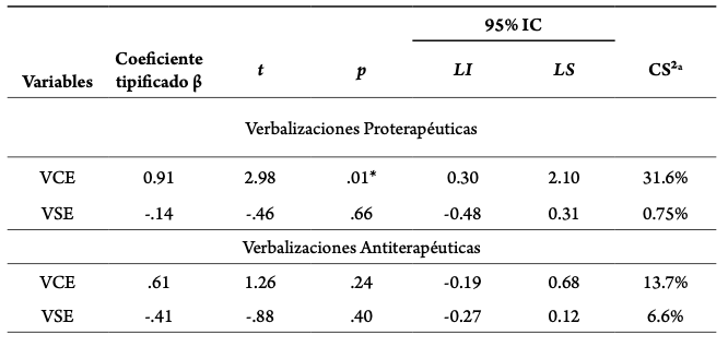 VCE = verbalizaciones con emparejamiento pavloviano; VSE = verbalizaciones sin emparejamiento pavloviano; IC = intervalo de confianza; LI = límite inferior, LS = límite superior; CS² = correlación semiparcial². aImportancia relativa al ajuste global. * p <.05En resumen, la hipótesis de que las verbalizaciones del terapeuta con emparejamiento pavloviano están relacionadas con cambios en la frecuencia de aparición de las verbalizaciones puede mantenerse en lo referente a las verbalizaciones proterapéuticas, no siendo así en lo referente a las antiterapéuticas.