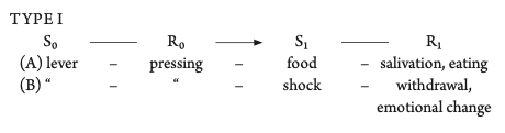 A conditioned reflex is said to be conditioned in the sense of being dependent for its existence or state upon the occurrence of a certain kind of event, having to do with the presentation of a reinforcing stimulus. A definition which includes more than this simple notion will probably not be applicable to all cases. At almost any significant level of analysis a distinction must be made between at least two major types of conditioned reflex. These may be represented, with examples, in the following way (where S = stimulus, R = response, (R – S) = reflex, = “is followed by”, and [ ] = “the strength of” the inclosed reflex):
