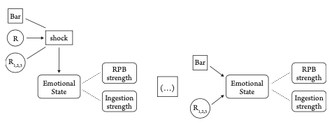 The bar pressing response generates shock. The shock is paired with the bar and also with response proprieties directed toward the bar. The operation “presentation of shock” produces an emotional state that correspond to the alterations in strength in more than one reflex (the reflex of bar pressing and that of ingestion, for example). After repeated exposures to the experimental arrangement, the bar and movements toward it (proprieties of the response) start to produce, due to the pairing with shock, the same emotional state, identified as a decrease in the strength of more than one reflex.