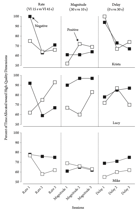 Baseline. The purpose of baseline was to screen for differential sensitivity to high-quality dimensions of each parameter of reinforcement (i.e., immediate, high rate, or high magnitude). During baseline, arbitrarily selected sounds (not matched) available from pools generated through preferred-sound and sound-escape assessments were delivered contingent upon responding to evaluate whether high-quality dimensions could control greater than 50% response allocation when alternative options delivered low-quality (i.e., delayed, low rate, or low magnitude) dimensions of the same parameter, when dimensions of all other parameters were constant (see Table 1).