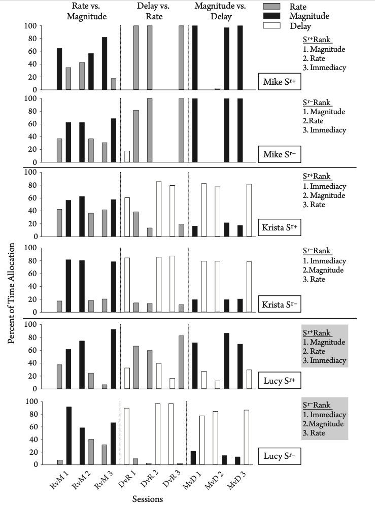 For Lucy, matched positive and negative reinforcers used during PSA tests produced average breakpoints of 5 (range 1-12) and 5 (range 0-12), respectively. In positive reinforcer PSAs, Lucy’s choices were most sensitive to high-quality magnitude manipulations, followed by rate, then delay. Conversely, in negative reinforcer PSAs, her responses were most sensitive to high-quality delay manipulations, followed by magnitude, then rate. When rate competed with magnitude, the average relative response allocation toward magnitude across the final three sessions of the condition was 77% (62-93%) in the positive reinforcer PSA and 73% (59-92%) in the negative reinforcer PSA. When delay competed with rate, the average relative response allocation toward rate across the final three sessions of the condition was 70% (range 60-83%) in the positive reinforcer PSA. In the negative reinforcer PSA, the average relative response allocation toward delay across the final three sessions of the condition was 95% (range 90-97%). When magnitude competed with delay, the average relative response allocation toward magnitude across the final three sessions of the condition was 76% (70-87%) in the positive reinforcer PSA. In the negative reinforcer PSA, the average relative response allocation toward delay across the final three sessions of the condition was 83% (78-87%). As was the case for Mike and Krista, positive reinforcement was selected to the full exclusion of negative reinforcement across all test conditions during Lucy’s posttest preference probes.