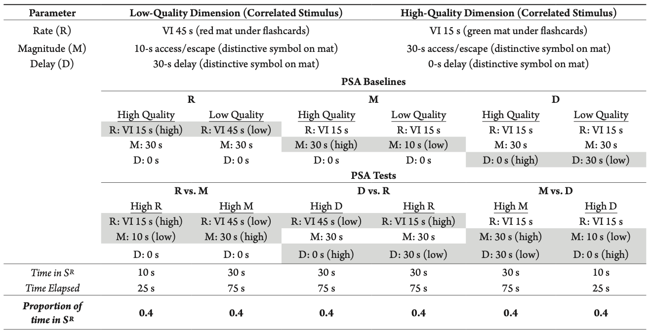 (top) Summary of specific values and correlated stimuli associated with high- and low-quality dimensions of reinforcement parameters: rate, magnitude, and immediacy. (middle) Summary of reinforcement parameters available at each response option during PSA baselines. (bottom) Summary of reinforcement parameters available at each response option, along with summaries of proportions of time spent in reinforcement (assuming exclusive responding toward a given option), during PSA tests.