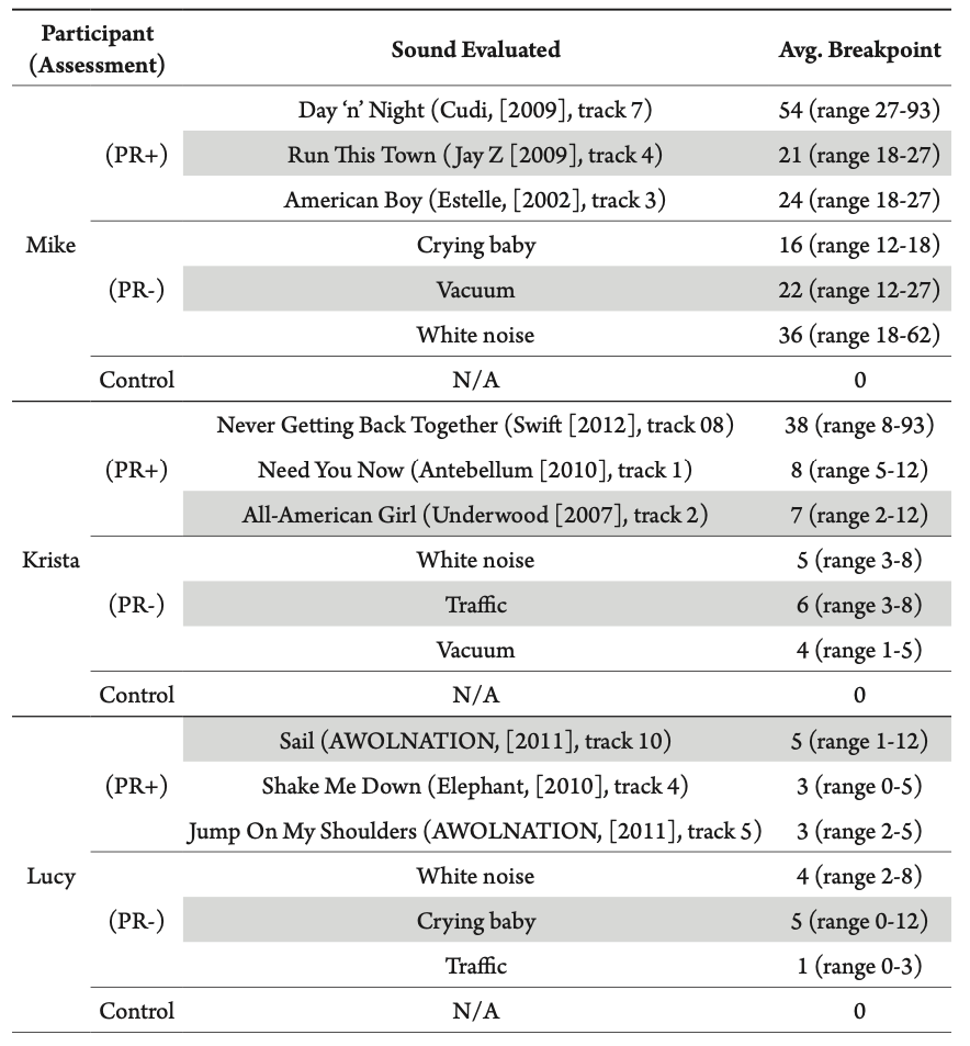 PR reinforcer assessments. The purpose of PR reinforcer assessments (adapted from procedures described by Hodos, 1961; and Knighton, Bloom, Samaha, & Clark, 2012) was to identify preferred and aversive sounds with “matched” average breakpoints (i.e., average breakpoints that fell within 1 PR step of one another) for use during test conditions of PSAs (described below). Three PR reinforcer sessions were conducted for each of three preferred sounds (identified during preferred-sound assessments), three sounds from which the participant consistently escaped (identified during sound-escape assessments), and a “no-consequence” control (to ensure that correct responding was not maintained by automatic reinforcement). Thus, 21 total PR-reinforcer sessions (three for each preferred sound, three for each aversive sound, and three for the no-consequence control) were completed by each participant. PR positive-reinforcer sessions were randomly rotated with PR negative-reinforcer sessions and control sessions to minimize prolonged exposure to aversive sounds. Sounds were selected arbitrarily from the pool of sounds generated by sound assessments described above.
