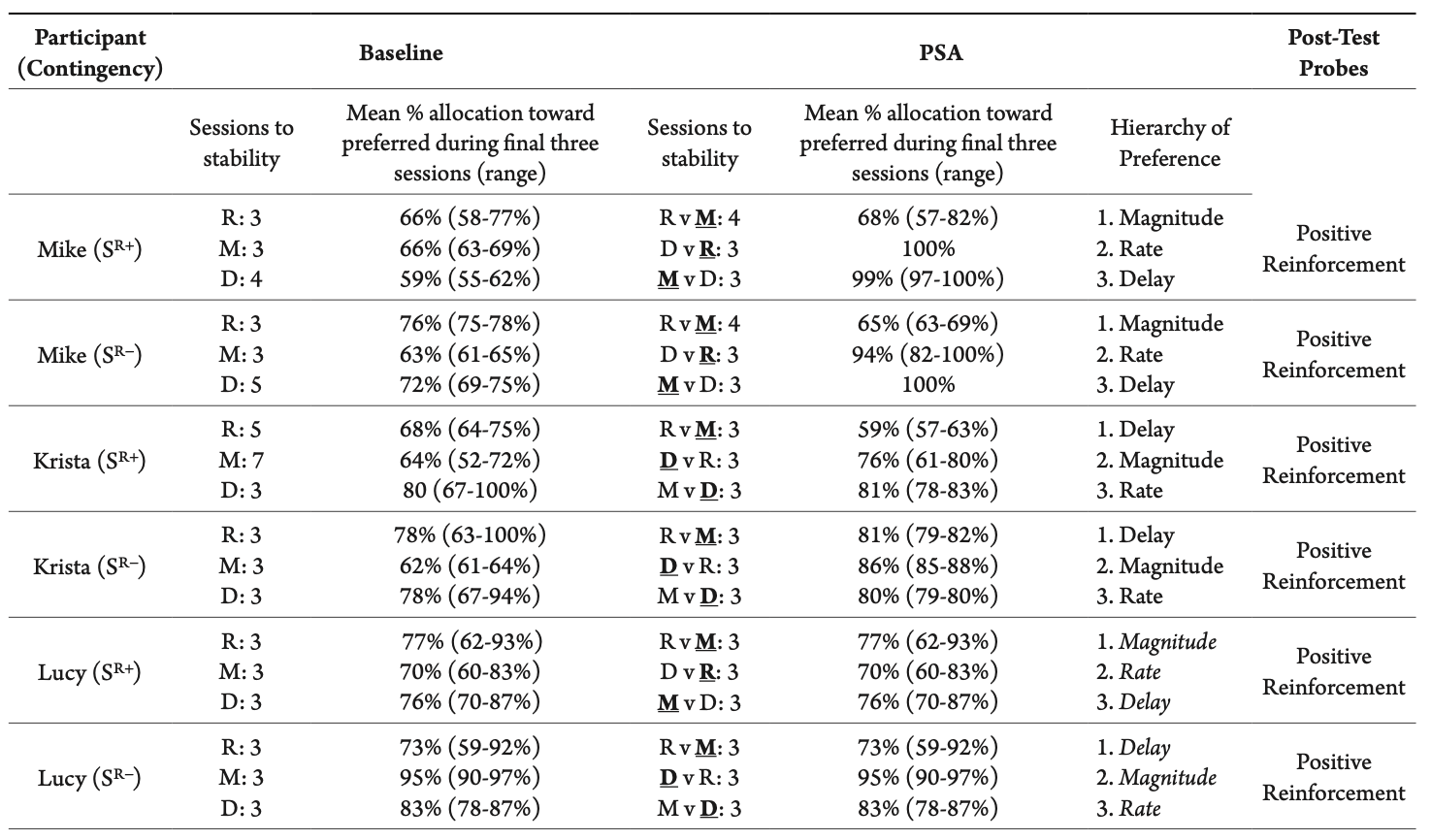 Results of PR reinforcer assessments are summarized in Table 2. Results of PSA baseline and test conditions, as well as post-test preference probes, are summarized in Table 3. The choice performance of each participant during the final three sessions of each PSA baseline condition is shown in Figure 1. During baseline, > 50% of responding was allocated toward response options with high-quality dimensions of the three parameters of reinforcement targeted for this study (i.e., rate, magnitude, delay), when the alternative produced low-quality dimensions of those same parameters. The criterion of differential sensitivity to high-quality dimensions of each parameter thus was achieved, advancing each participant to the PSA test. Because positive and negative reinforcers used during baseline were not matched, their relative effects on response allocation were not compared.
