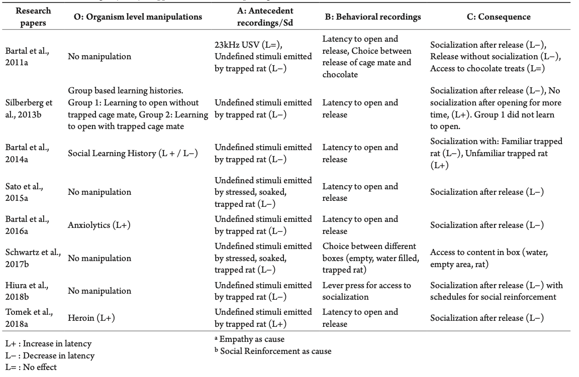 Terminology and design have differed greatly between social-release experiments rooted in behaviorism (Hiura et al., 2018) or social neuroscience (Bartal et al., 2011; Sato et al., 2015; Tomek et al., 2018). Although reviews of rodent models of empathy exist (e.g., Sivaselvachandran, Acland, Abdallah, & Martin, 2016), no attempts have been made to integrate and review both social reinforcement and empathy-based studies of rodent social release. Research from either field contributes little to the other. The criticism of the empathy explanation might be addressed briefly before being discarded (Tomek et al., 2018) or not even mentioned at all (Shan, Bartal, & Mason, 2016). Thus, the three-term contingency will be used to analyze and systematize selected data from the social-release paradigm. With the three-term contingency, these two main approaches to the problem can be included in a manner that remains neutral regarding causality, but which elucidates what has been investigated and what is lacking.