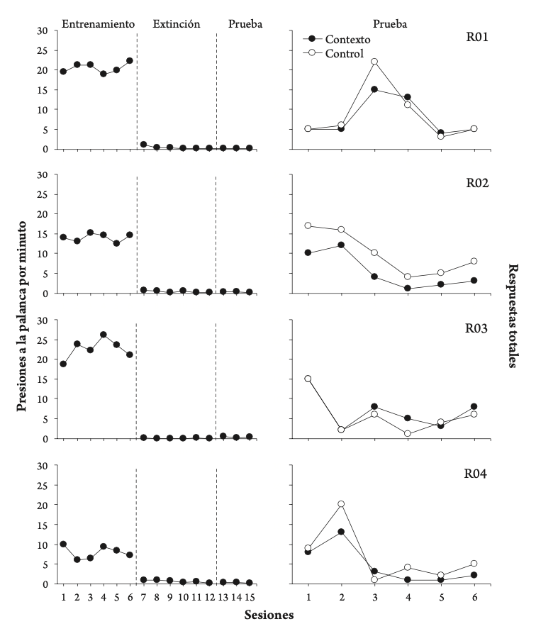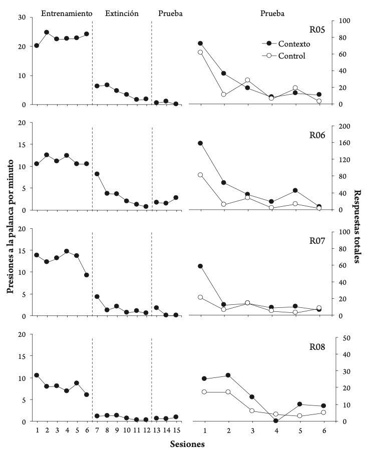 En los paneles del lado derecho de la Figura 2 se muestran las presiones a la palanca para las palancas Contexto y Control que fueron introducidas durante la Fase 3. Las respuestas en la palanca Contexto fueron consistentemente más frecuentes que las respuestas en la palanca Control durante las dos primeras sesiones para todas las ratas. En R05 se llegaron a observar hasta 72 presiones en la palanca Contexto durante la primera sesión, las cuales fueron decreciendo, hasta ser superadas por las respuestas en la palanca Control en la tercera sesión. En R06 se observaron hasta 158 respuestas en la palanca Contexto, las cuales nunca fueron superadas por las ocurridas en la palanca Control. En R07 se observaron hasta 58 respuestas que rápidamente decrecieron, y en R08 se llegaron a observar hasta 27 respuestas durante la segunda sesión de prueba, siendo 17 la máxima cantidad de respuestas observadas en la palanca Control.