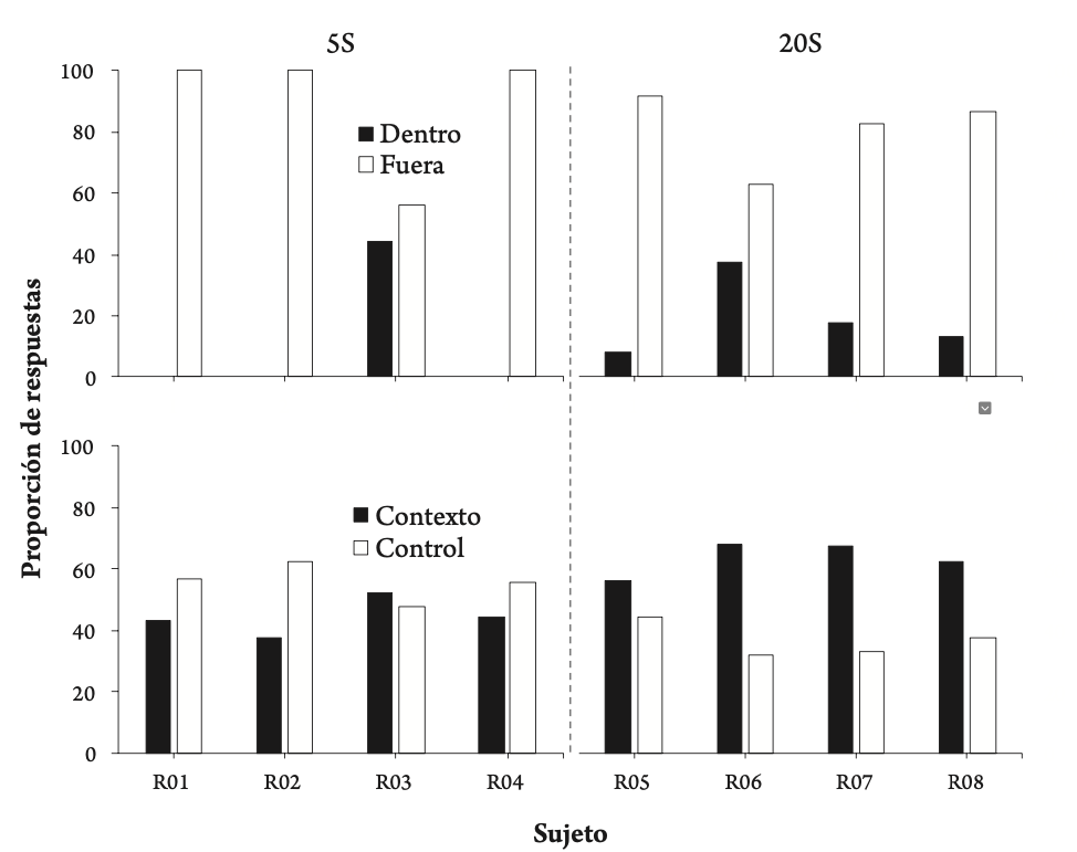 El panel inferior derecho de la Figura 3 muestra la proporción de respuestas totales a las palancas Contexto y Control durante las sesiones de prueba para el grupo 20S. Se observó una mayor proporción de respuestas en la palanca Contexto para todas las ratas, con valores que alcanzaron entre el 60 y 70% de las respuestas.