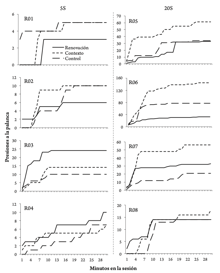 En los paneles del lado izquierdo de la Figura 4 se observan las presiones a las tres palancas durante la primera sesión de prueba a través del tiempo para las ratas del grupo 5S. Se observaron respuestas únicamente durante la primera mitad de la sesión para R01 y R02, mientras que R04 se mantuvo activo durante toda la sesión, particularmente en la palanca Control. A diferencia de los otros sujetos, se observaron respuestas únicamente durante los primeros minutos de la sesión para R03, aunque las presiones a la palanca del panel trasero (Renovación) y la palanca Contexto correlacionan de manera positiva. En los paneles del lado derecho de la Figura 4 se observan las presiones a las tres palancas durante la primera sesión de prueba a través del tiempo para las ratas del grupo 20S. Para R05 se observaron respuestas durante toda la sesión, principalmente en la palanca Contexto, mientras que para R06, R07 y R08 la mayor parte de las respuestas se registró al inicio de la sesión. Para R07 y R08, a diferencia de los otros sujetos, se observó contigüidad temporal entre las presiones a la palanca del panel trasero (Renovación) y las presiones a la palanca Contexto. Para las cuatro ratas, se observó una mayor frecuencia de respuestas en la palanca Contexto en comparación con las demás palancas.
