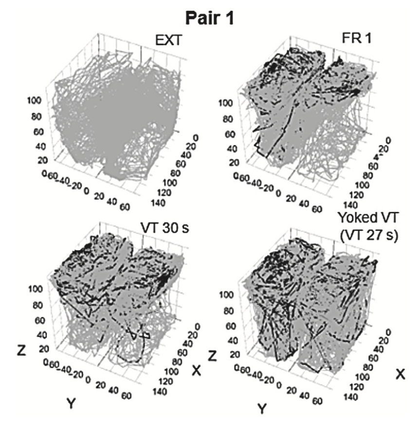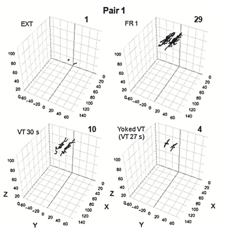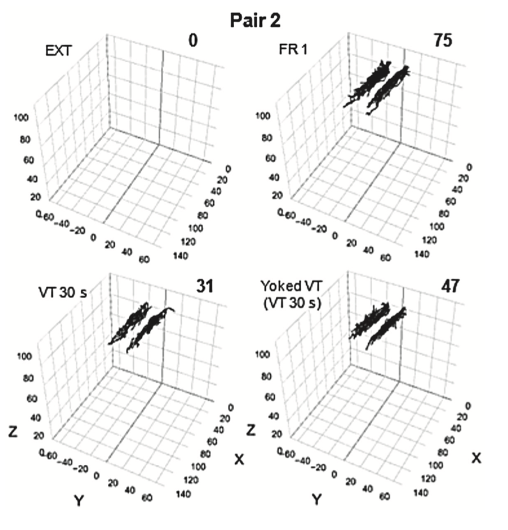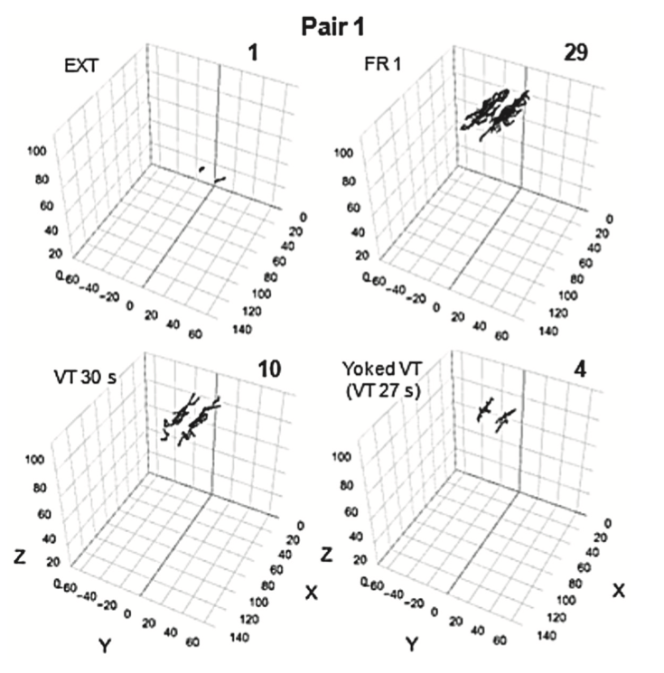 Informal observations indicated that the fish occasionally tracked the motion of each other, swimming in the same direction like “schooling” near the glass partition. This form of behavior differed from the target approach response in that schooling was a more global description of fish motion rather than a discrete momentary response. Figures 5a-5c show a portion of the 3D trajectory in the last session of each condition for each pair of fish, which can be considered schooling. Inclusion criteria for the analysis were as follows: 1) Across successive detections, the fish in a pair had to remain close in space to each other, namely, within the distance of 1 cm on the .-axis, 2.3 cm on the .-axis (i.e., 1 cm away from each side of the glass partition for each fish), and 0.5 cm on the z-axis (which approximately was the body size of zebrafish on the dorsoventral axis); and 2) the distance for which the fish swam while keeping the physical proximity had to be greater than 1.5 cm. The value in the right top corner of each graph in Figures 5a-5c indicates the frequency of schooling. For all four pairs of fish, the frequency was higher in the VT, FR, and yoked-VT (when conducted) conditions than the EXT condition and this form of behavior occurred mostly near the water surface, suggesting an effect of food delivery. Moreover, the frequency was the highest in the FR condition for Pairs 1 and 2. This indicates that, for these two pairs of fish, schooling increased as a function of arranging the reinforcement contingency for the approach response. In contrast, the frequency of schooling was higher in the VT condition than in the FR condition for Pairs 3 and 4.